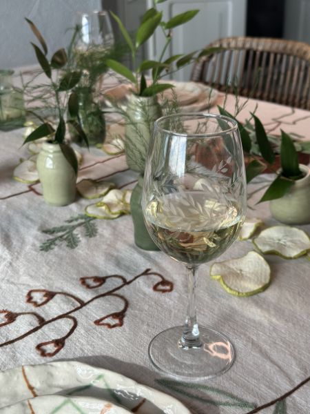 Soft green vases, filled with fresh sprigs, bring life to the table. The embroidered tablecloth adds a quiet beauty of its own. On our Ruth plates, pan-fried cod loin is served with potatoes and spring vegetables. A sip of cider or white wine – and the moment instantly feels lighter.