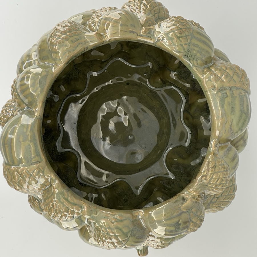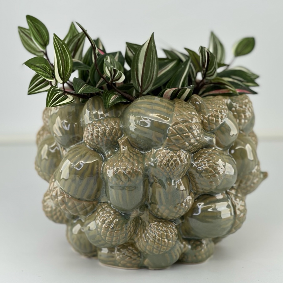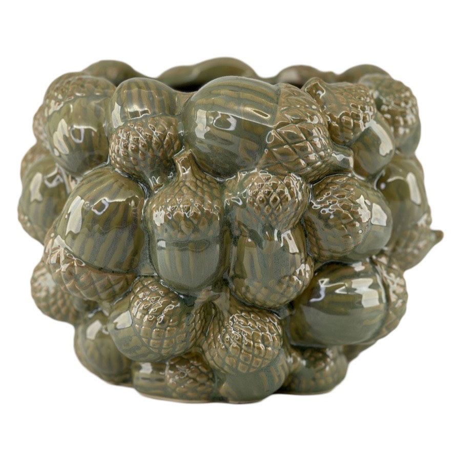En dekorativ kruka i keramik formad som ett hav av ekollon. Den glansiga ytan i gröna nyanser ger liv åt detaljerna. En charmig höstfavorit som sticker ut i varje rum.