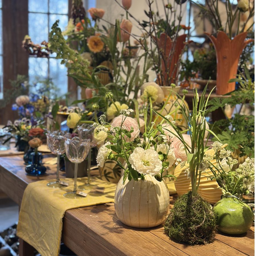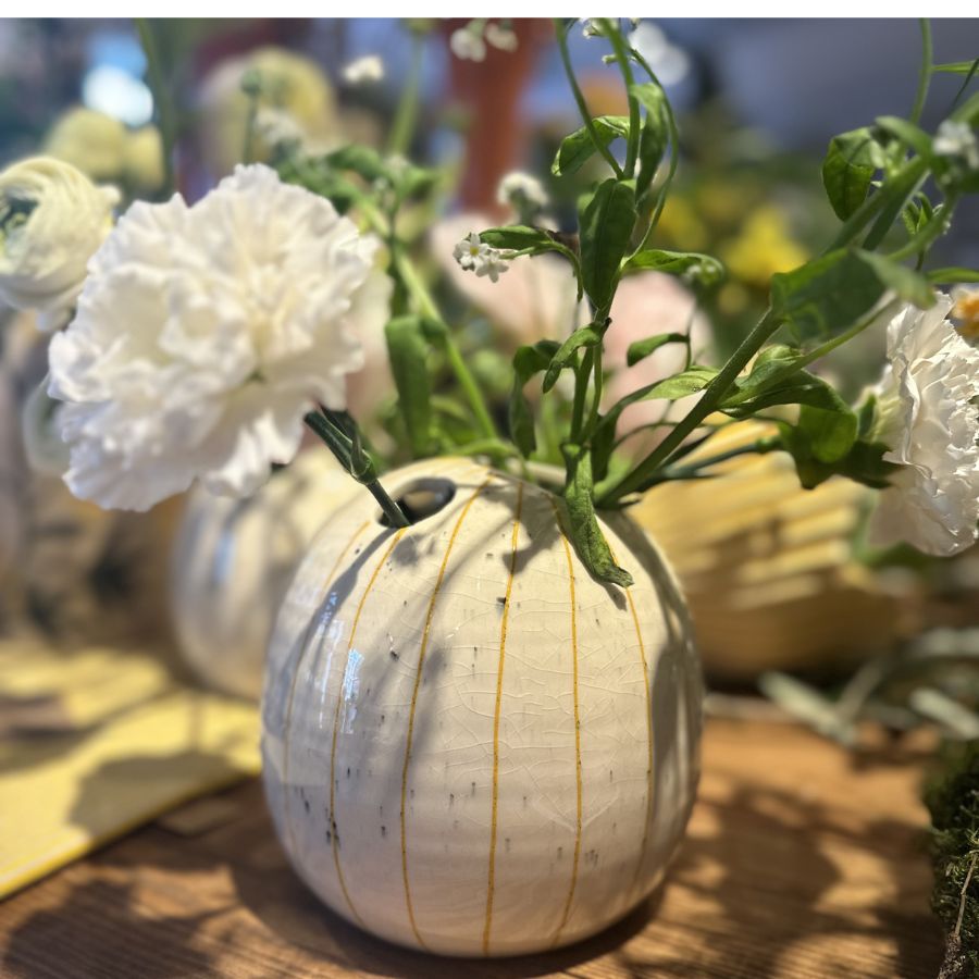 Vas med flera hål för att sätta snittblommor/grenar/gräs/växter i. Vasen är handmålad med smala ränder. Det handmålade gör att varje produkt blir unik.