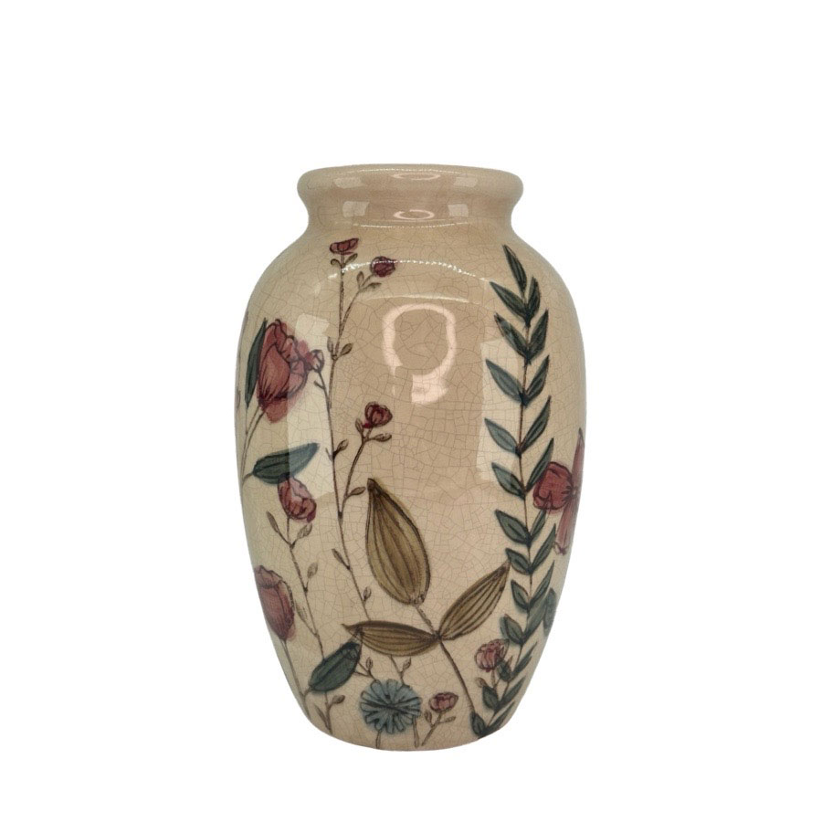 Vas med handmålat mönster av blommor och stjälkar i mjuka toner. Det handmålade gör att varje produkt blir unik.