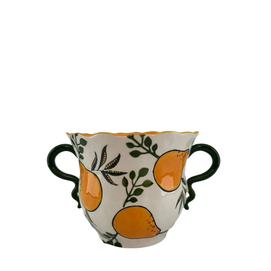 Kruka med handtag. Handmålad i starka färger av orange och grönt. Finns i två storlekar.
