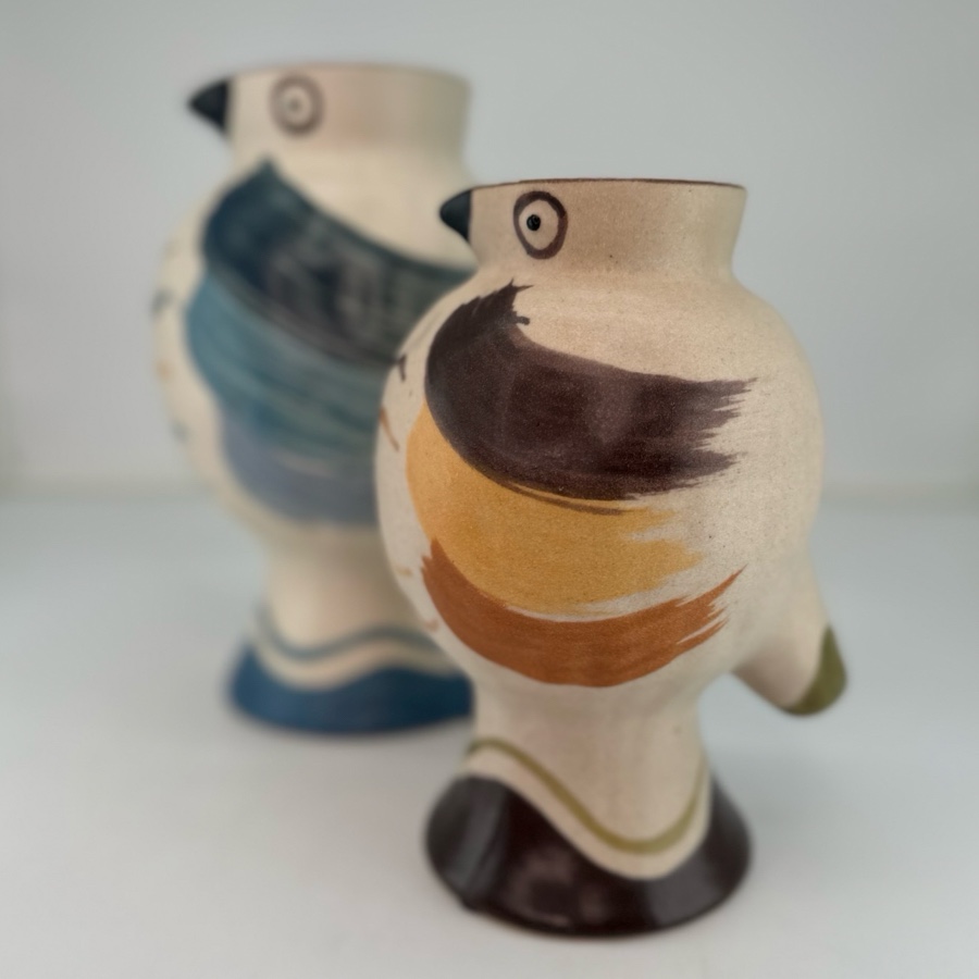 En vas handmålad med mönster av en fågel. Färgerna går i de jordnära tonerna.