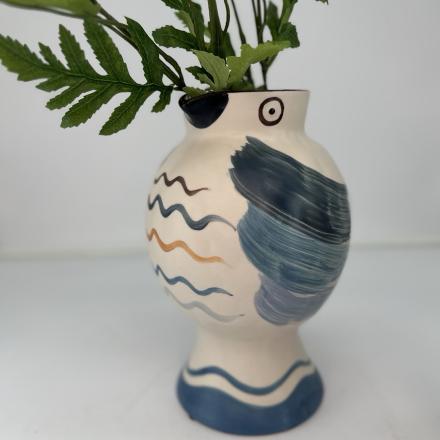 En vas handmålad med mönster av en fågel. Färgerna går i blåa toner.