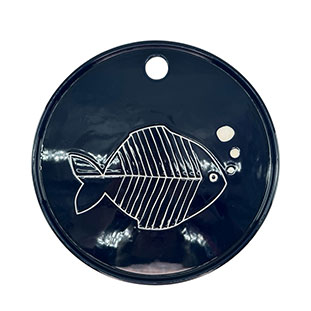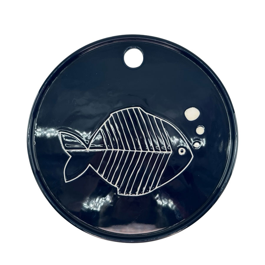 Fat med motiv av en fisk. Har ett hål som gör att man kan hänga fatet på en krok. Fatet är tillverkad av keramik.
