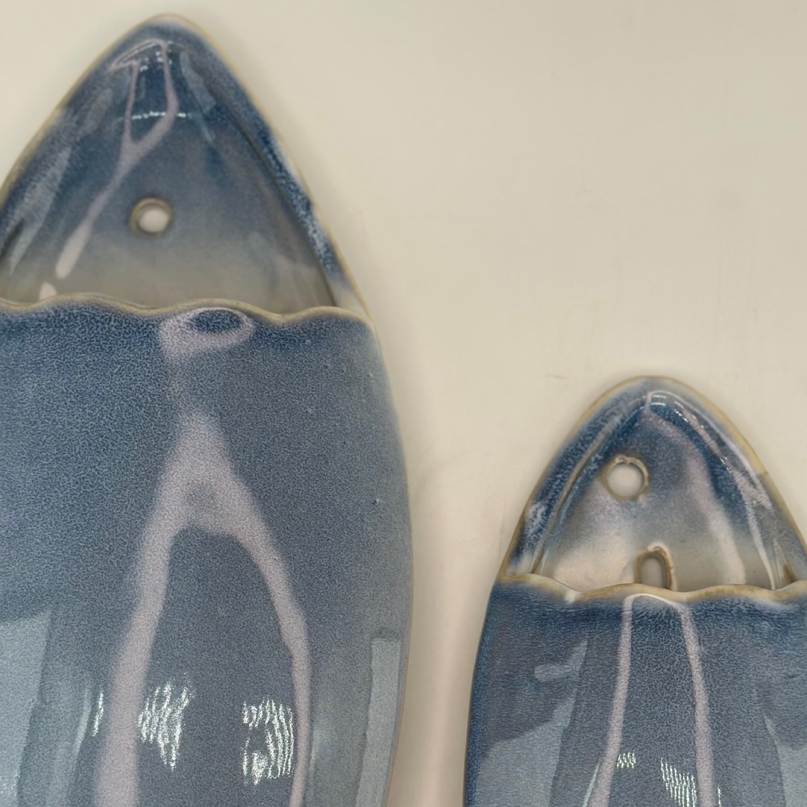 En väggvas i form av en fisk. Har ett hål och går att hänga på väggen. Tillverkad i keramik.