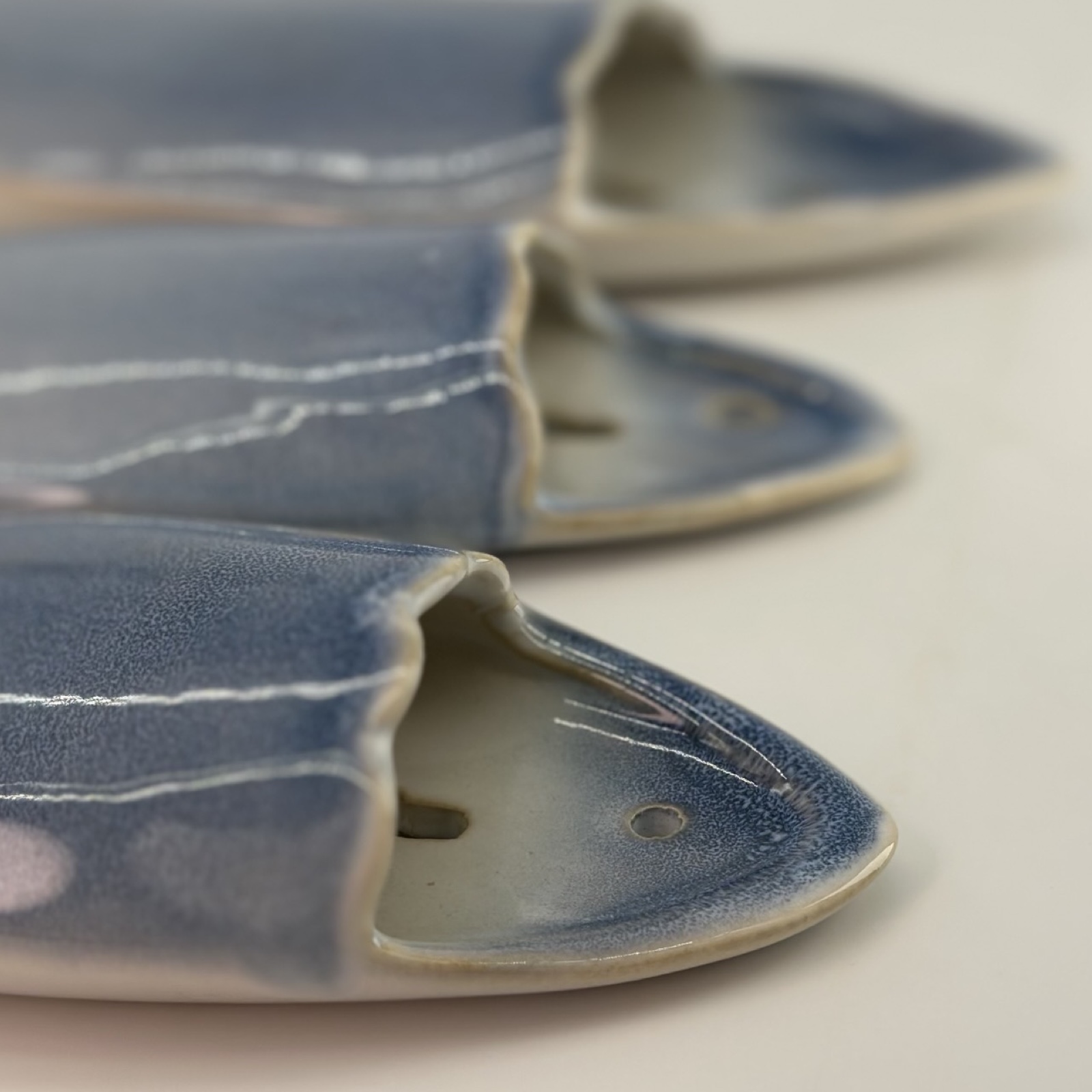 En väggvas i form av en fisk. Har ett hål och går att hänga på väggen. Tillverkad i keramik.