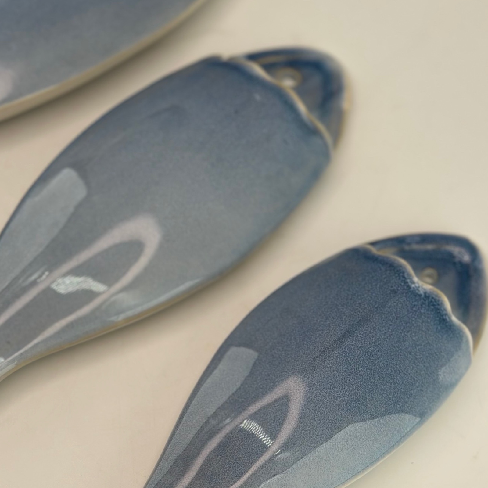 En väggvas i form av en fisk. Har ett hål och går att hänga på väggen. Tillverkad i keramik.