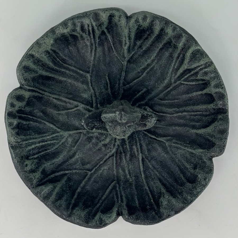 Dekorativt fågelbad med en groda, tillverkat i gjutjärn.