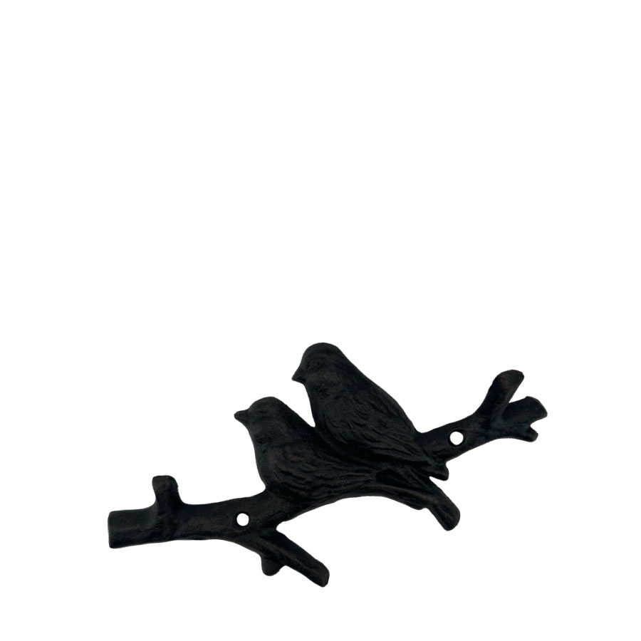 Väggkrok i form av gren och två fåglar. Tillverkad i gjutjärn.
