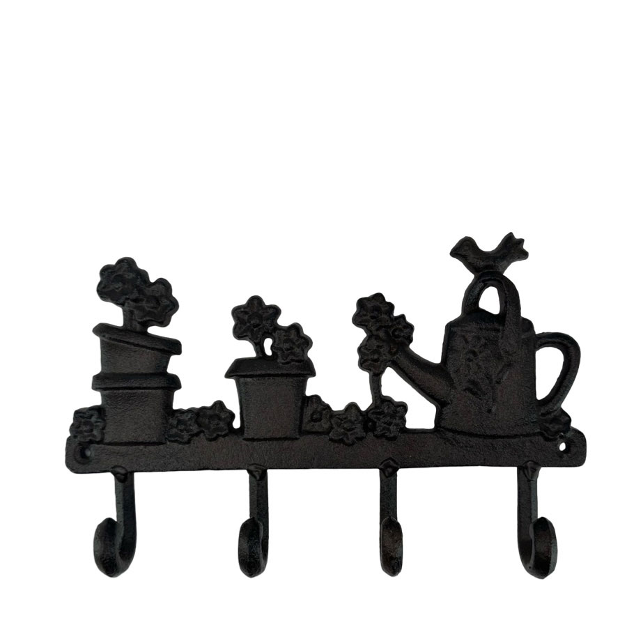 Väggkrok med 4st hängare med hink och krukor. Tillverkat i gjutjärn.