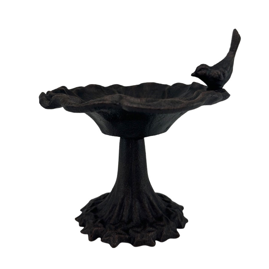 Dekorativt fågelbad på fot, fågel på kanten. Tillverkat i gjutjärn.
