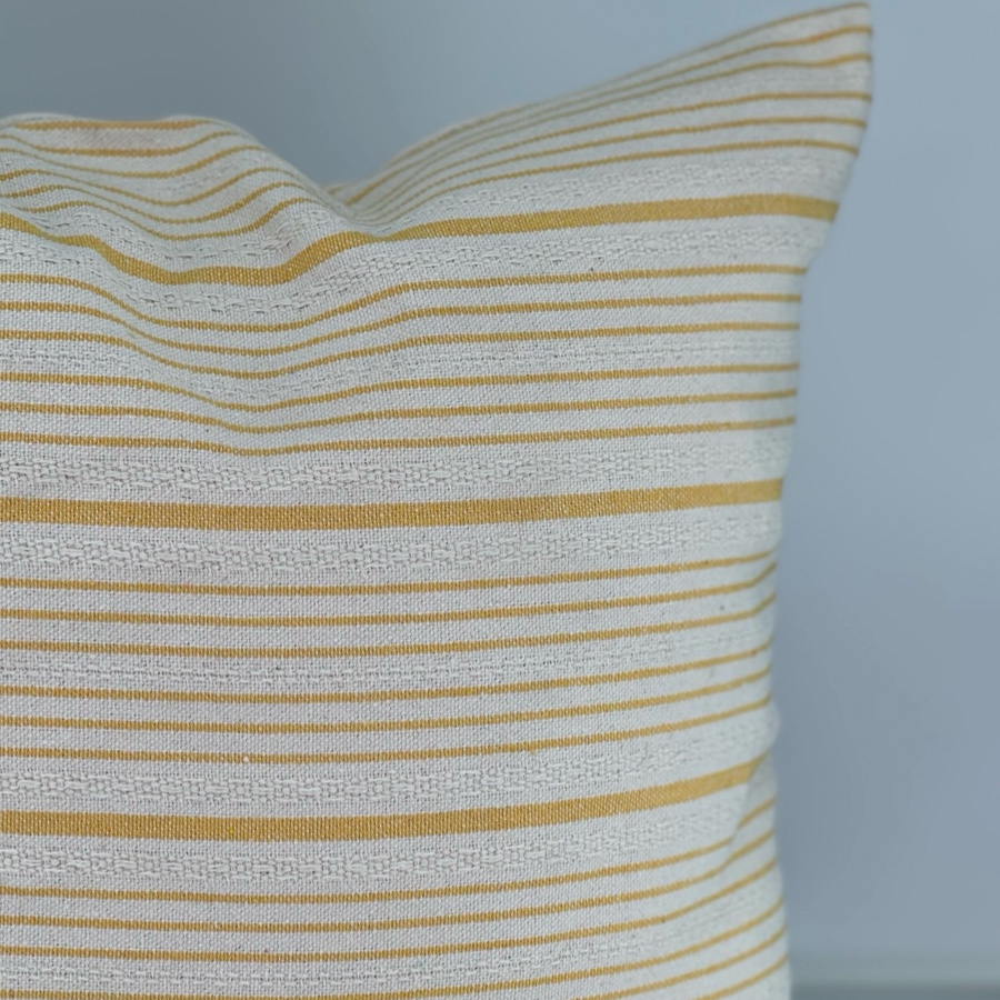 Ett gulrandigt kuddfodral. Tvättas enkelt i maskin vid behov. Tillverkad i en polyesterkvalitet som har en känsla och struktur av linne. Passar bra till innerkuddar i storlekarna 45x45 och 50x50.