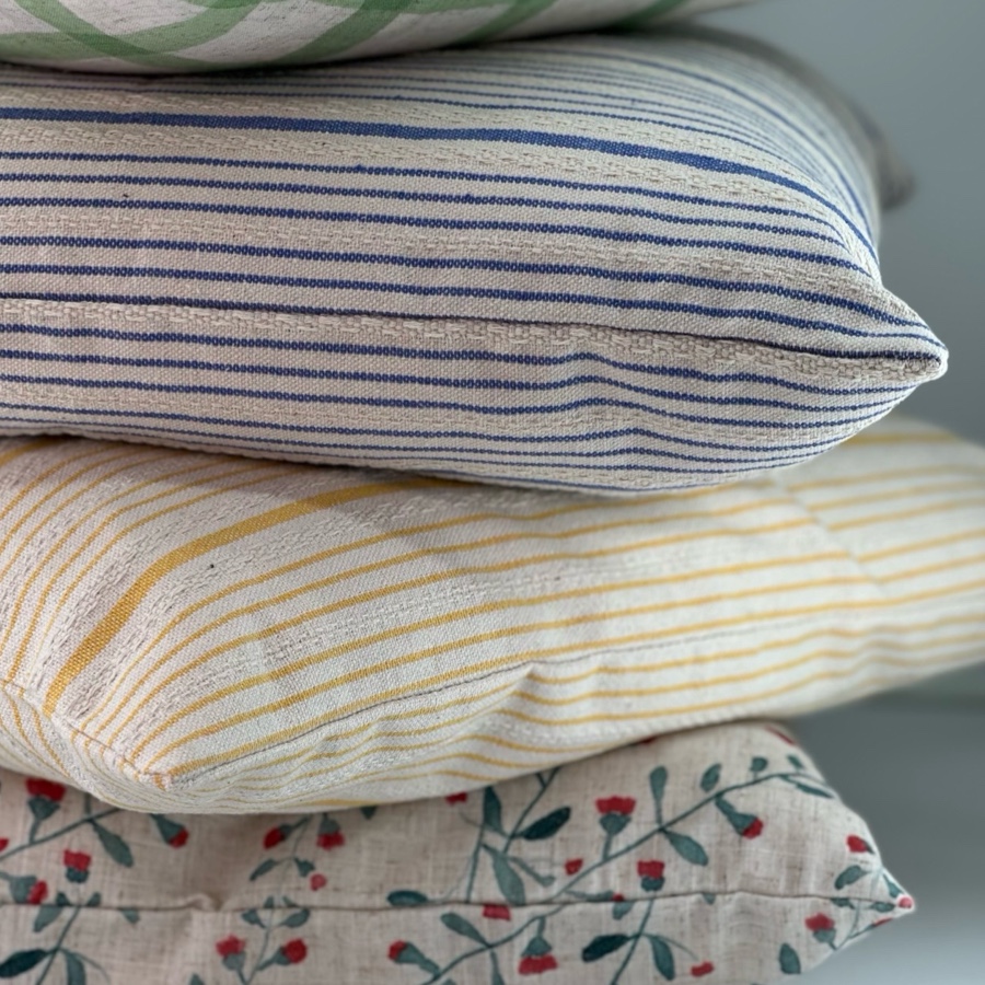 Ett blårandigt kuddfodral. Tvättas enkelt i maskin vid behov. Tillverkad i en polyesterkvalitet som har en känsla och struktur av linne. Passar bra till innerkuddar i storlekarna 45x45 och 50x50.