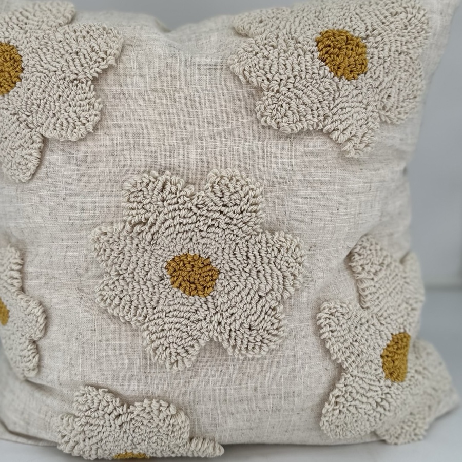Ett kuddfodral med stora stickade blommor på framsidan. Passar bra till innerkuddar i storlekarna 45x45 och 50x50.