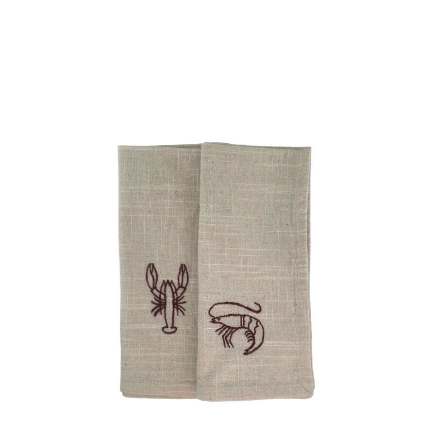 Tygservetter i två assorterade brodyr - kräfta & räka. Tillverkade i 100% bomull. Pris per styck. Tvättas i 30 grader, ingen torktumling