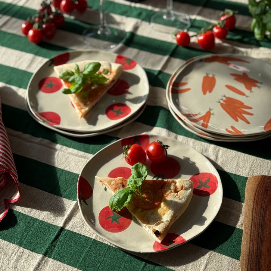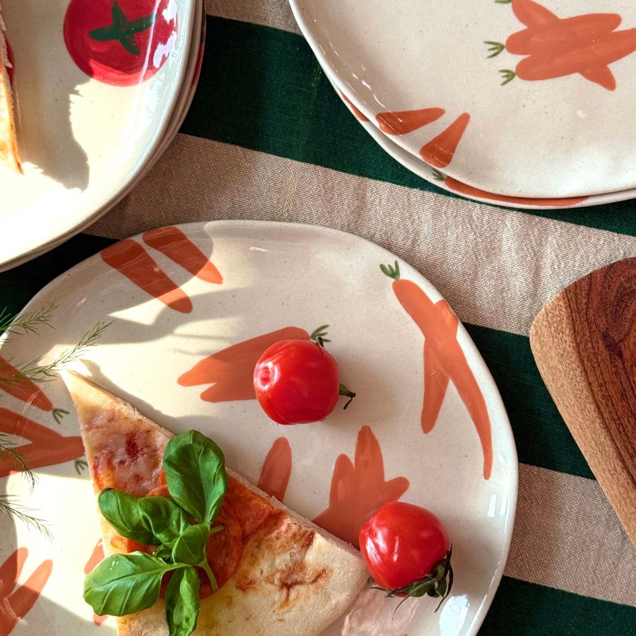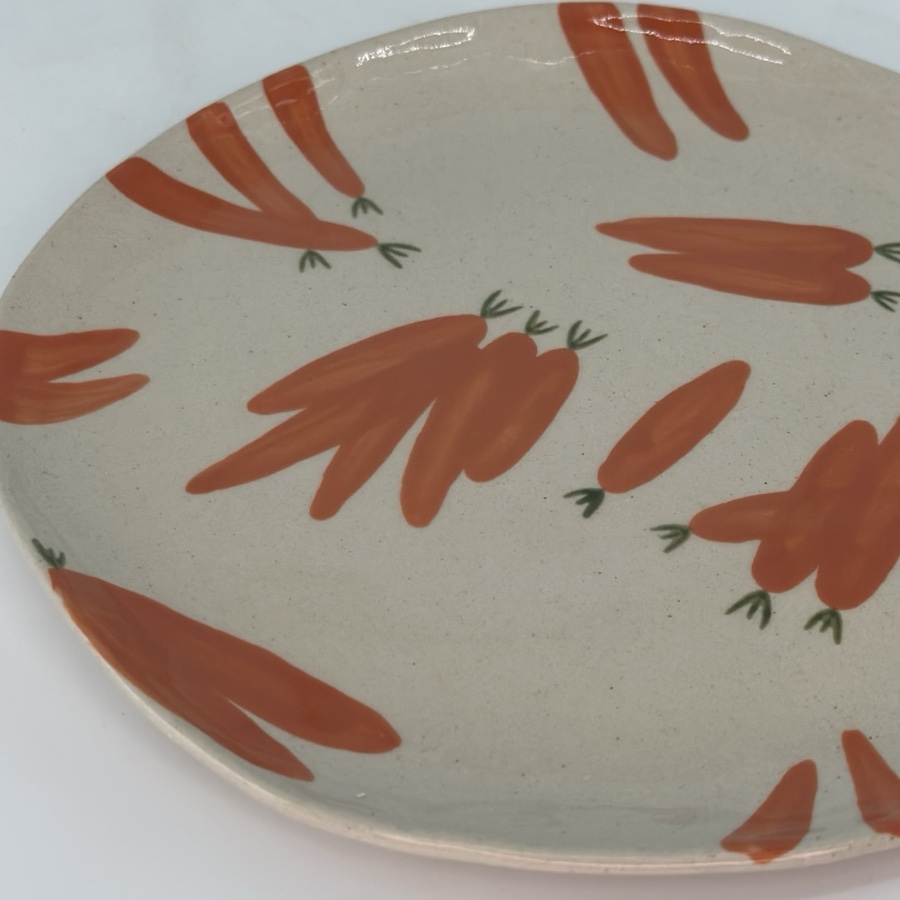 En assiett med handmållat mönster av morötter. Varje tallrik är unikt handmålad, vilket ger den ett personligt uttryck och gör den till ett riktigt fin detalj att servera något gott på.