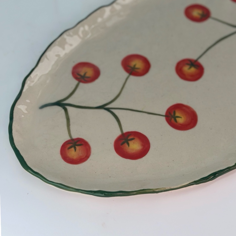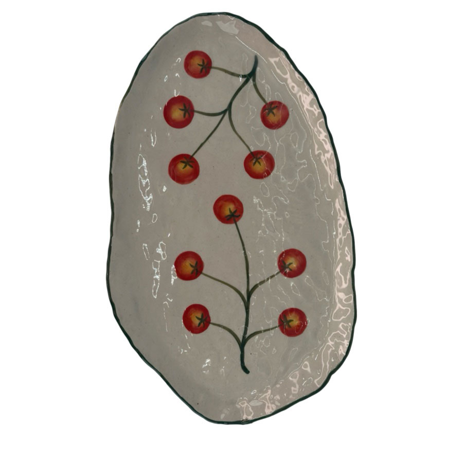 Ett avlångt fat med handmålat mönster av kvisttomater. Varje fat är unikt handmålad, vilket ger den ett personligt uttryck och gör den till ett riktigt fin detalj att servera på.