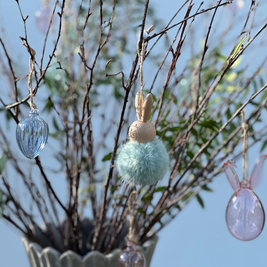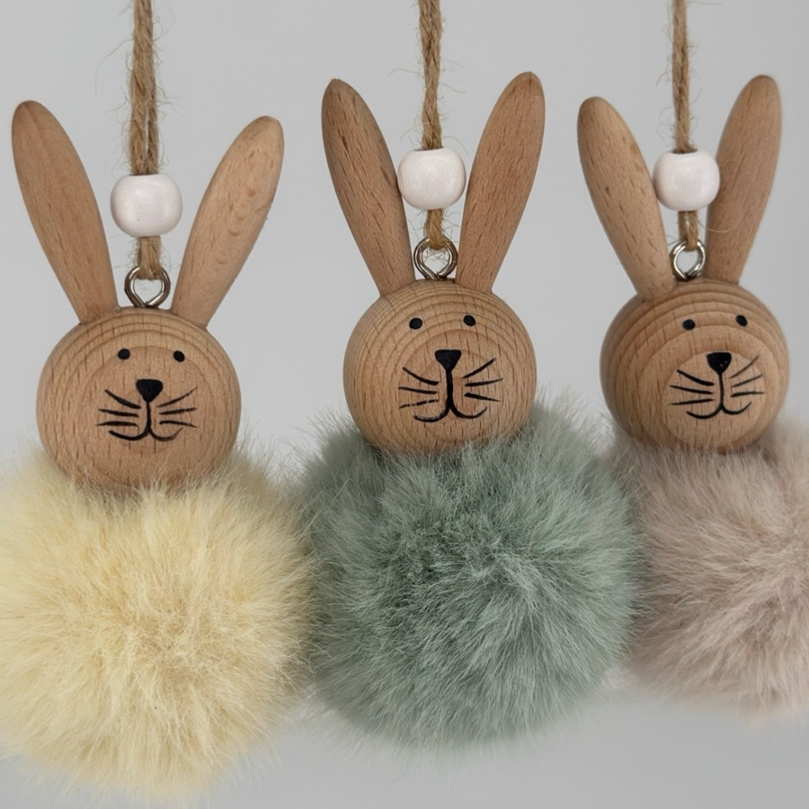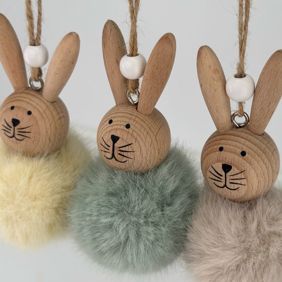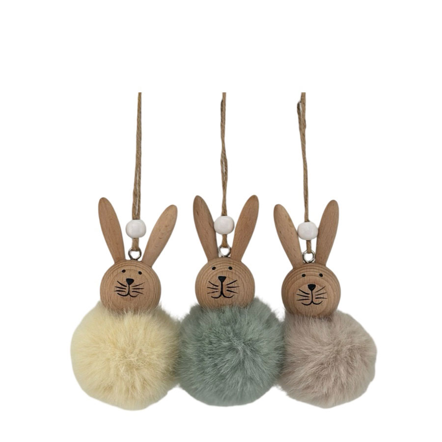3 små fluffiga påskkaniner tillverkade i trä och polyester. Levereras i en ask.