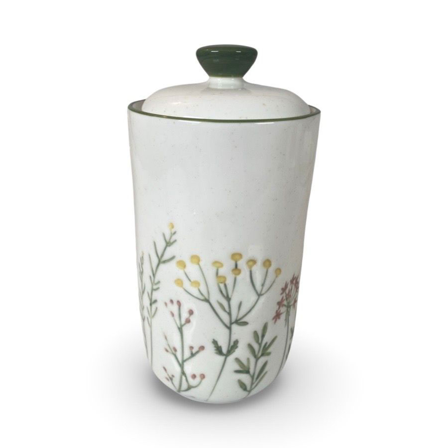 En burk med lock i serien Happy. Handmålad med vackert blommönster. Fin att förvara till exempel kakor eller skorpor i.